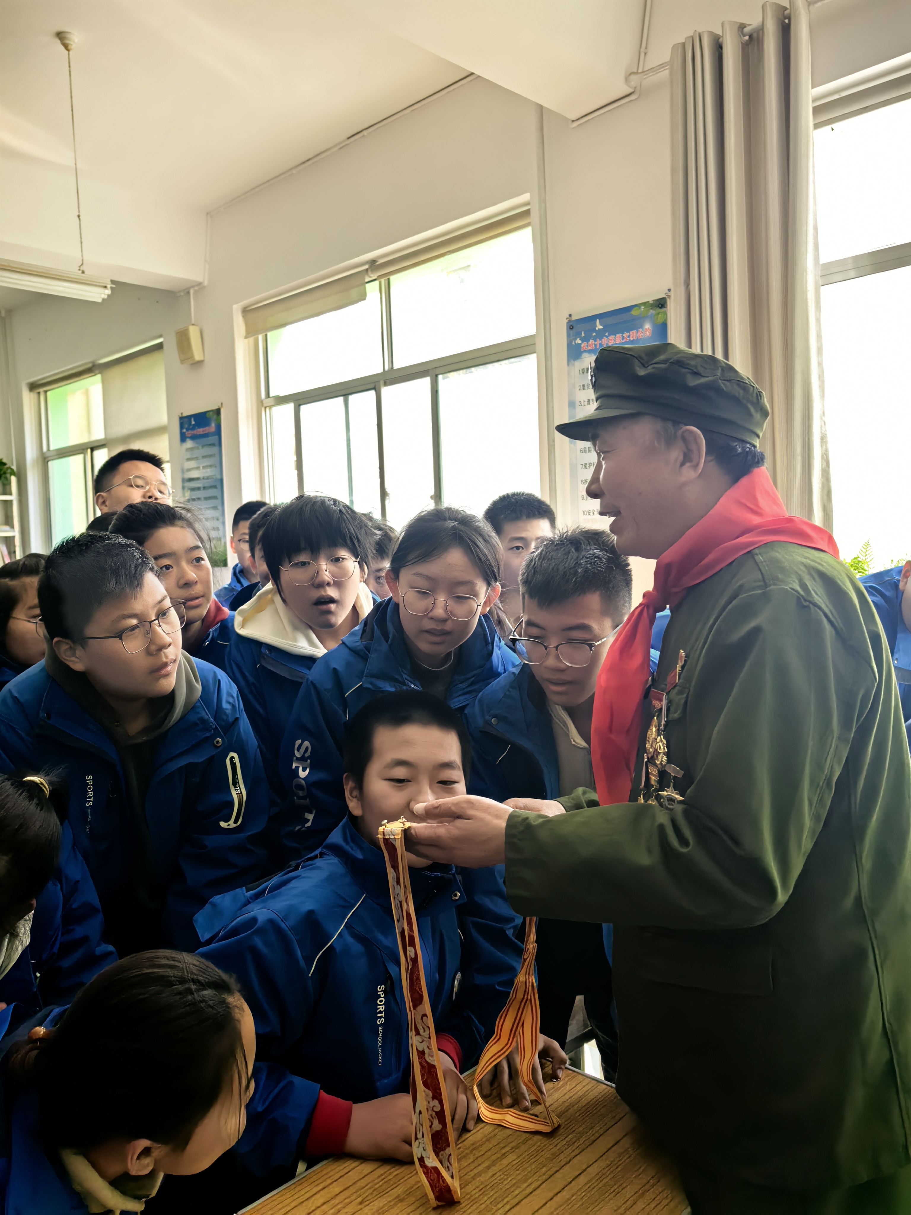 活动现场气氛庄重热烈,少先队员代表为老兵前辈、现役军人及现场嘉宾敬献红领巾,优秀团员青年献上鲜花,以少年特有的方式表达对英雄的崇敬与礼赞。参战老兵、一等战功英雄模范卢向虎结合自身亲身战斗经历,深情讲述战场上的峥嵘岁月与战斗故事,用朴实的语言、真挚的情感,诠释了军人“捍卫国家主权、坚守家国大义”的初心与担当,让师生们真切感受到革命先辈浴血奋战的铁血荣光和深沉的家国情怀。