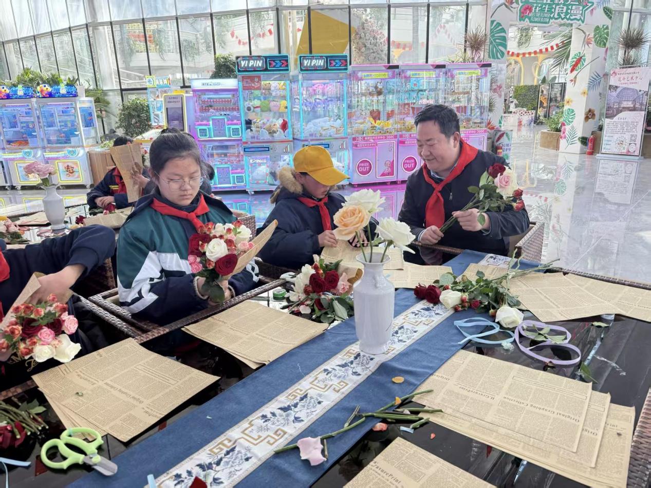学交流互动,厚植家国情怀。研学交流活动在鲜花港举办,州关工委副主任丁生才参加并为活动致辞。随后,系列互动环节依次展开,花艺制作课堂上,同学们在专业花艺师指导下修剪花枝、搭配花束,将对美的理解融入创作之中。心理健康小课堂通过趣味游戏与案例分享,帮助青少年缓解成长焦虑,培育积极阳光的心态;“话家乡·写理想”互动环节中,大家踊跃发言,讲述家乡变迁故事,在理想墙上郑重书写人生愿景,言语间满是对家乡的热爱与对未来的无限憧憬。同学们在指定场地有序就餐,餐后的才艺展示环节精彩纷呈,唱歌、朗诵、演讲等节目轮番上演,充分展现了农村青少年的多才多艺与青春风采。活动尾声,全体人员起立共唱《少年先锋队队歌》,嘹亮的歌声回荡在场馆内,传递着新时代青少年的昂扬朝气与奋进力量。