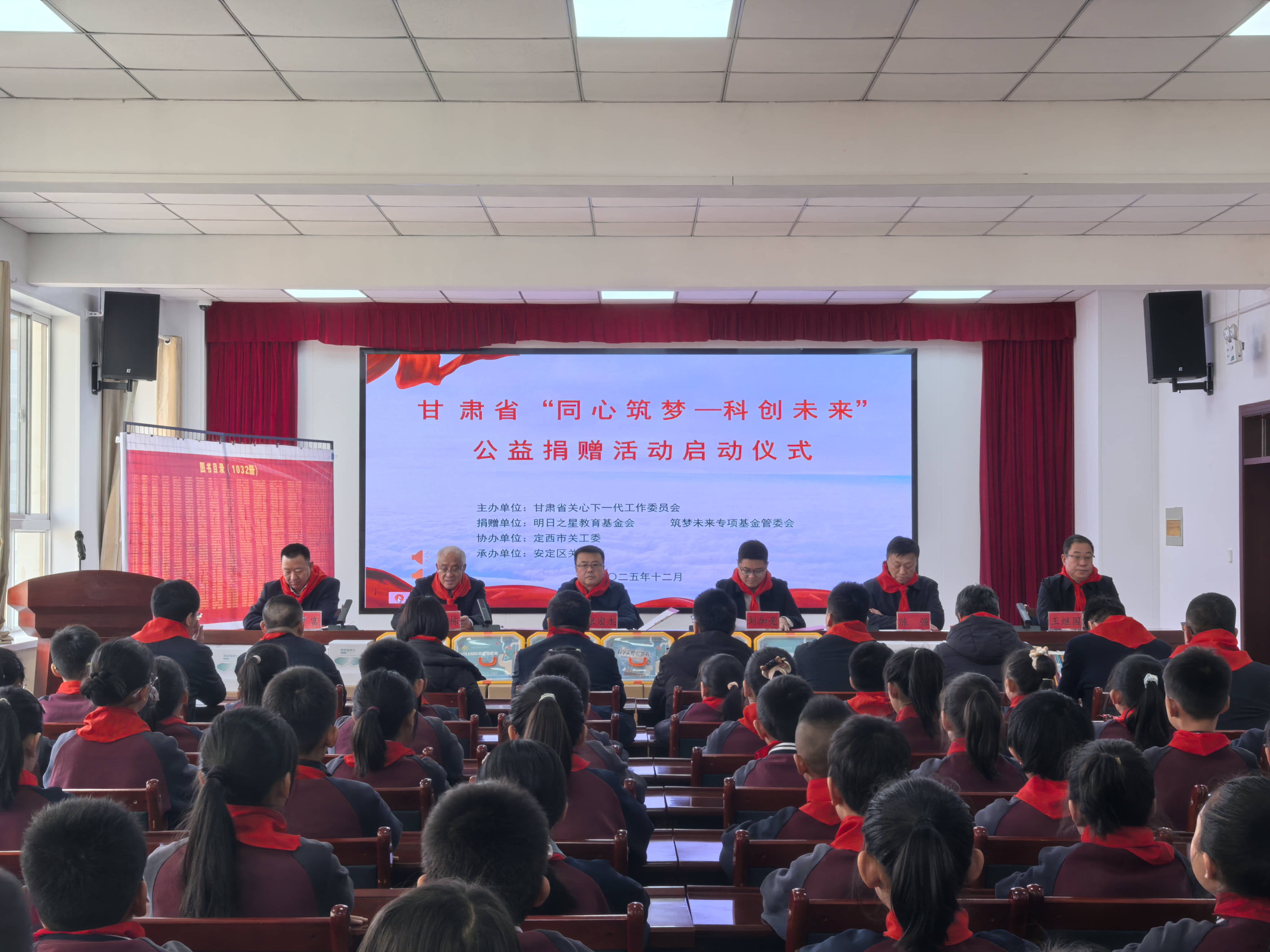 仪式上,明日之星教育基金会向省关工委、定西市关工委捐赠了教育教学物资,定西市关工委向安定区第一实验小学捐赠了价值24680元的爱心图书。