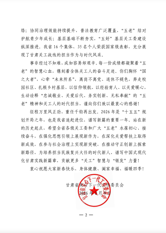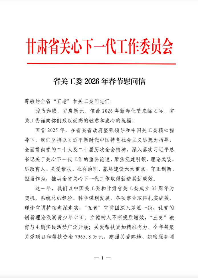 省关工委2026年春节慰问信
