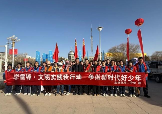 三月春风暖校园,雷锋精神伴成长。在县关工委指导下,金塔县第二中学关工委精心组织学雷锋系列主题实践活动。启动仪式上,全体学子庄严宣誓,将“奉献、友爱、互助、进步”的志愿精神内化于心。从承诺到行动,30余名志愿者走进航天广场开展卫生清理,历时近两小时让公共设施焕然一新,以“红马甲”的身影传递奉献的快乐。县关工委表示,此次活动不仅让二中学子深刻领会奉献的意义,更以雷锋精神为引领推动志愿服务常态化,为青少年思想道德建设注入鲜活力量。